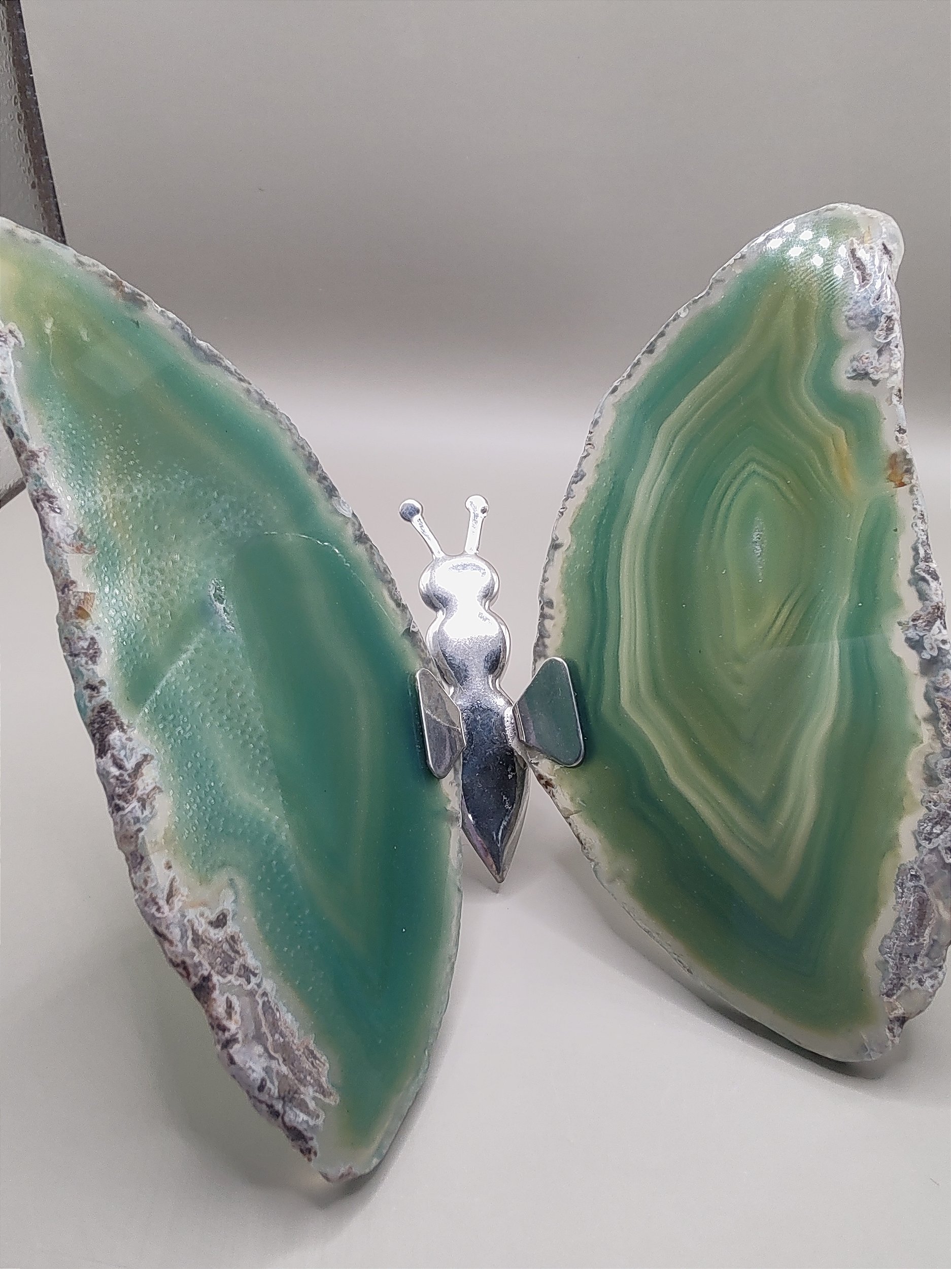 Composta por duas chapas de Ágata e corpo metálico, podendo abrir ou fechar mais as asas ( com cuidado para não quebrar).